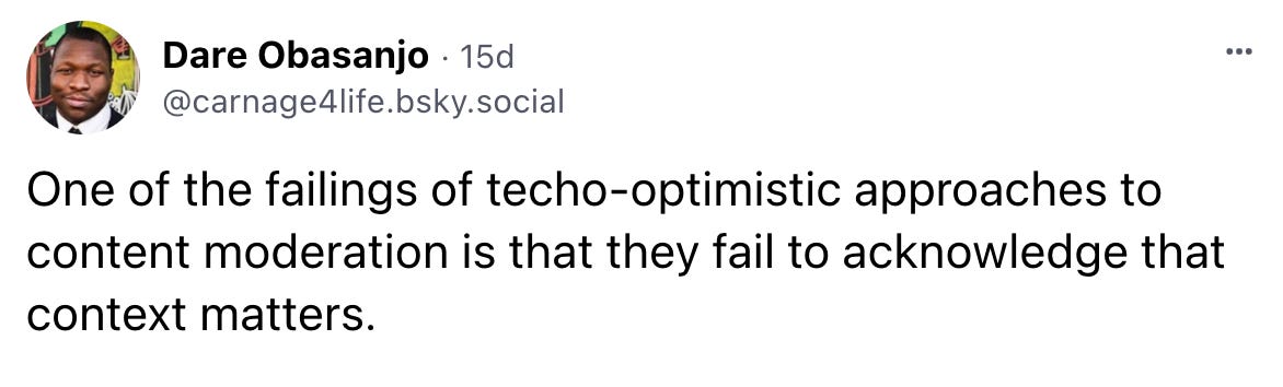 A Bluesky post calls this style of moderation a form of techno-optimism, whereby we continue to throw more technology at human and social problems.